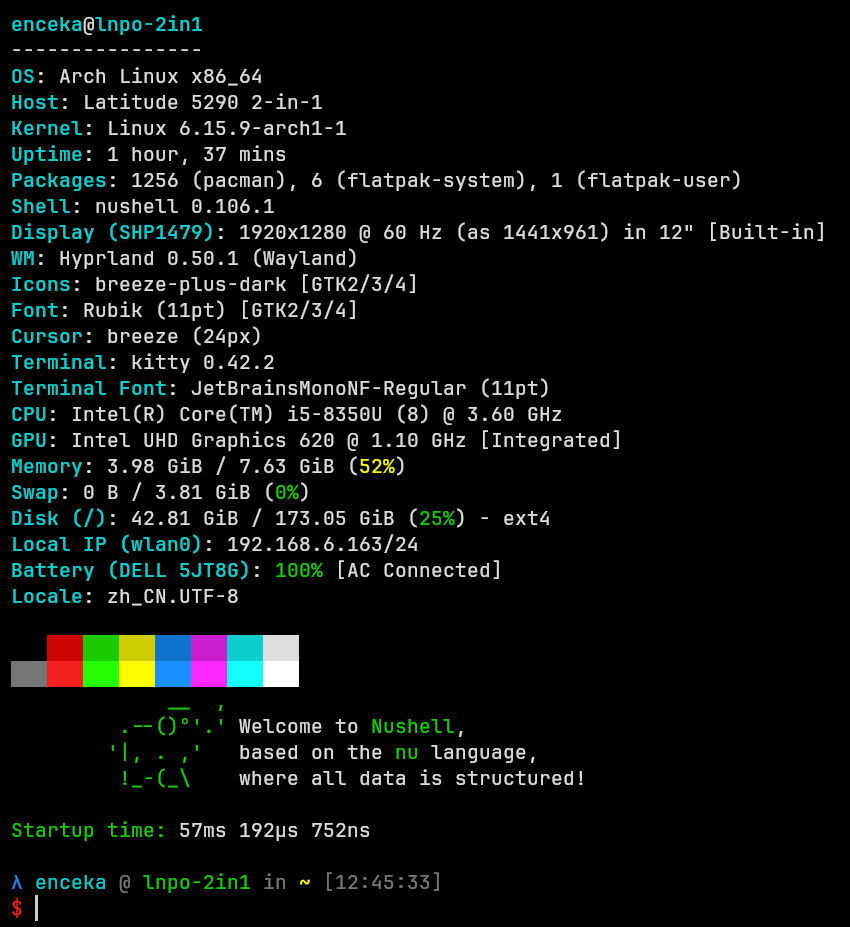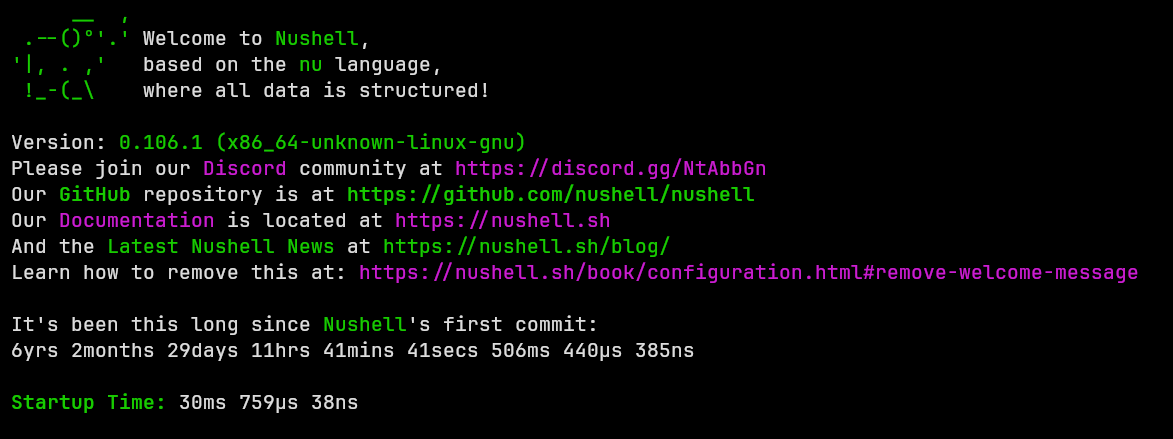 def show_banner [] { fastfetch --logo none print $" (ansi green) __ ,(ansi reset) (ansi green) .--\(\)°'.' (ansi reset)Welcome to (ansi green)Nushell(ansi reset), (ansi green)'|, . ,' (ansi reset)based on the (ansi green)nu(ansi reset) language, (ansi green) !_-\(_\\ (ansi reset)where all data is structured!" print $"Startup Time:" ($nu.startup-time) print $""}show_banner但是这种会导致Startup Time显示为-1ns